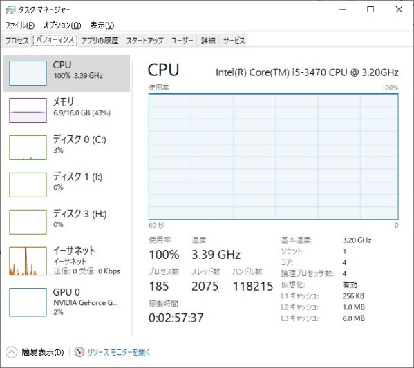 GPUについては使用率が2%で、動画書き出し中はほとんど使われていないことがわかりました。