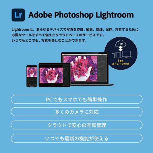 Adobe Creative Cloud フォトプラン(Photoshop+Lightroom) with 1TB 12か月版はこちらからご契約いただけます。
