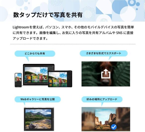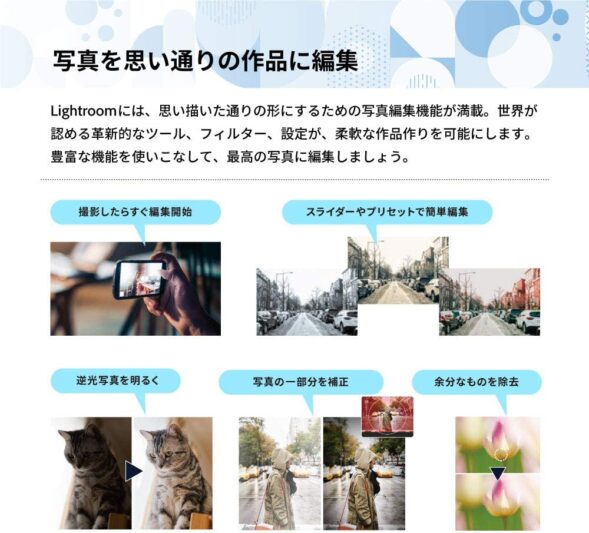 Adobe Lightroomは写真編集が簡単にできる機能が搭載されています。
